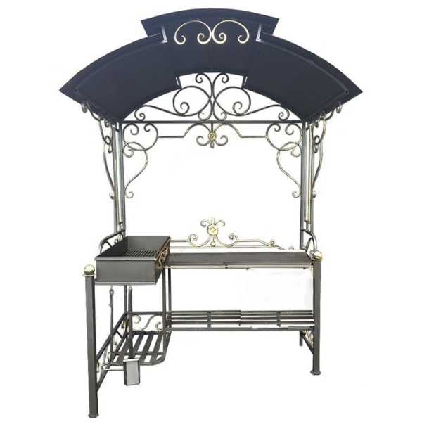 Отдельное достоинство мангала с крышей “Модерн” – презентабельный внешний вид, оригинальный кованый декор с золотым покрытием, красивая скатная крыша.