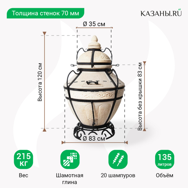 Высота тандыра с крышкой - 120 см, без крышки - 83 см. Диаметр жаровни составляет 83 см, диаметр горловины - 35 см. Толщина стенок очага - 7 см. Печь поставляется с набором из 20 шампуров, подставкой под тандыр и подставкой под крышку, держателем для шампуров, совком, кочергой, чугунным колосником. Поставки и аксессуары имеют элементы ковки, которые служат в качестве дополнительного украшения тандыра. В изделиях выделяются декоративные завитки и узоры.