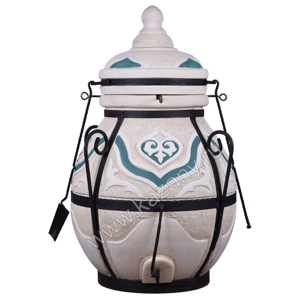 Жаровня укомплектована 12 шампурами, подставкой под крышку, аксессуаром для подвешивания шампуров, совком, чугунным колосником, кочергой. В комплекте также имеется подставка под тандыр. Поверхность печи украшена узорами, стенки с толщиной 8 см усилены металлическим кованым каркасом и ручками. В подставках предусмотрены красивые завитки.
