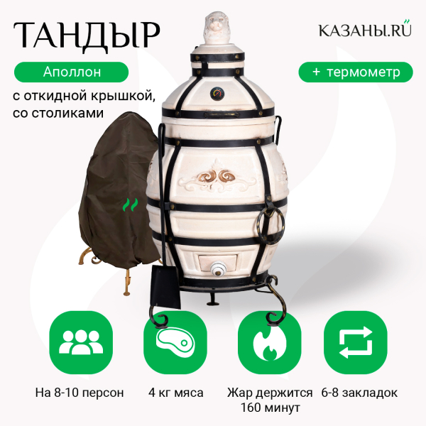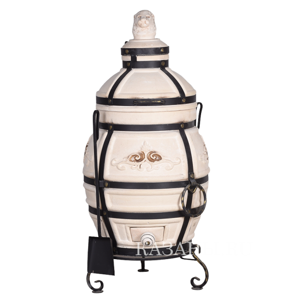 Тандыр "Аполлон" - небольшая керамическая печь, рассчитанная на использование в частном доме. Стенки очага украшены орнаментом. Жаровня сохраняет тепло в течение 2-3 часов, в ней можно готовить блюда в несколько закладок.