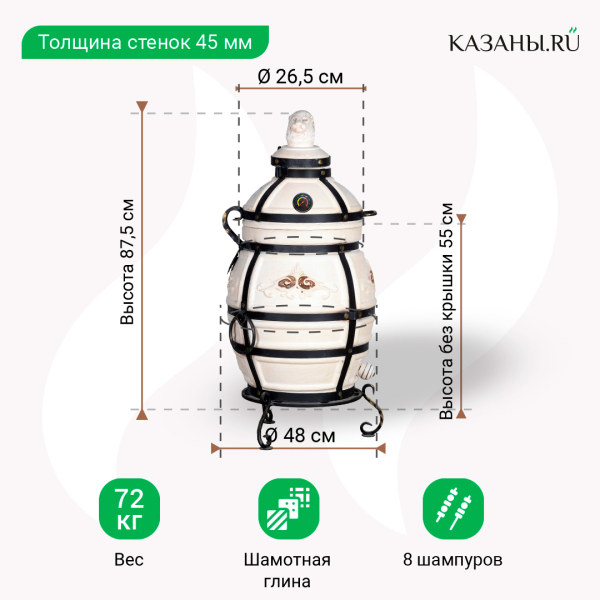 Высота тандыра - 87 см, без крышки - 55 см. Диаметр в самой широкой части - 45 см, размер горловины - 27 см. Толщина стенок составляет не менее 6 см, что обеспечивает печи превосходную теплоемкость. В холодное время года такой тандыр лучше не использовать, но в прохладную погоду он отлично держит тепло и медленно отдает его в камеру. Вес тандыра - 80 кг. Такие печи несложно перевозить, если есть личный автомобиль. При эксплуатации в частном доме очаг перемещают, когда возникает необходимость.