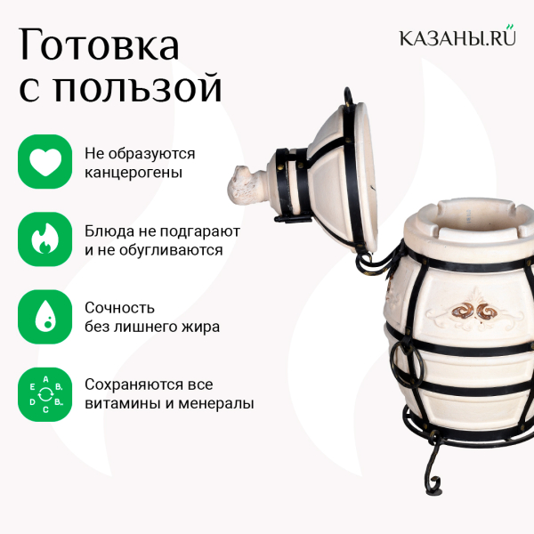 Печь относится к категории мобильных. Ее можно использовать в частном доме или вывозить на природу. Стенки очага усилены коваными обручами, соединенными в единый каркас. К каркасу присоединены ручки-кольца, за которые печь легко поднять, чтобы перенести. Тандыр безопасен при эксплуатации на природе - печь не является источником открытого огня и не создает риск пожара.