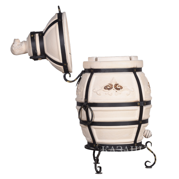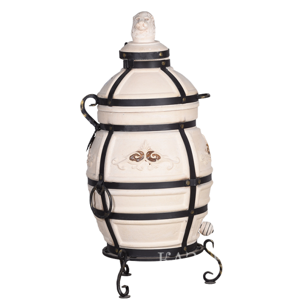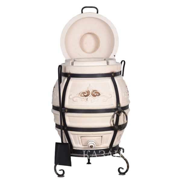 Печь имеет форму овального бочонка, в ней предусмотрена двухуровневая крышка. Чтобы проверить готовность блюда, достаточно поднять верхний колпачок. Шамотная глина, из которой изготовлен этот очаг, придает продуктам особый вкус. В печи можно приготовить блюда из мяса, птицы, рыбы, овощей. В ней получается вкусная выпечка: лаваши, пироги, лепешки, хачапури, самса и многое другое.