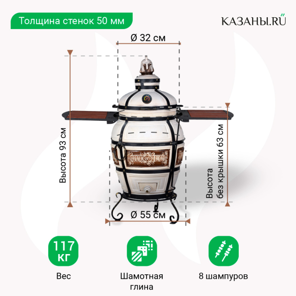 Высота тандыра с крышкой - 93 см, без крышки - 63 см. Диаметр жаровни в широкой части - 55 см, горловины - 32 см. Толщина стенок - от 5 см. Большое отверстие горловины позволяет использовать в тандыре емкие аксессуары: большие этажерки, камни с увеличенным диаметром, чугунки.