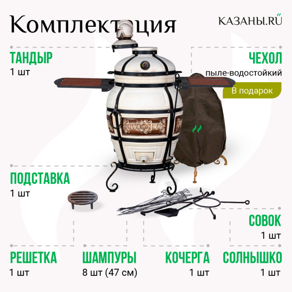Печь поставляется с набором из 8 шампуров, кованой подставкой под тандыр, чугунным колосником, кочергой и совком. При необходимости можно выбрать модель в расширенной комплектации или подобрать аксессуары, которые расширяют перечень доступных блюд.
