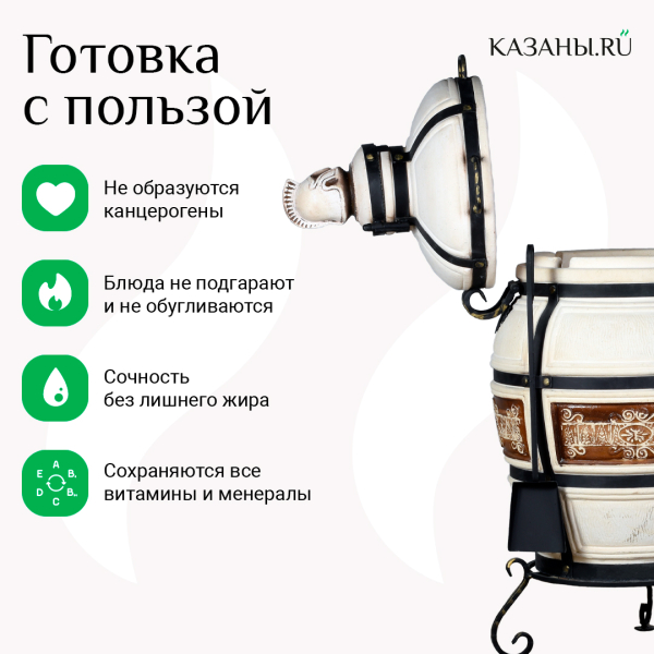 Конструкция изготовлена из качественной шамотной глины. При изготовлении печь проходит высокотемпературный обжиг. Очаг отличается экологичностью, экономичным расходованием тепла, долговечностью, оптимальной теплоотдачей. Печь медленно отдает тепло, за счет чего греет дольше.