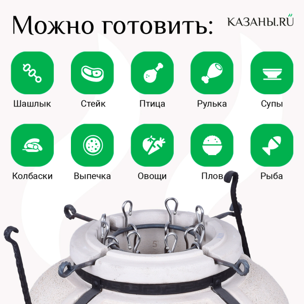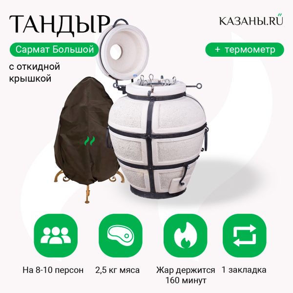 Тандыр изначально - печь кочевых народов, поэтому даже самые большие модели являются мобильными. В них предусмотрены ручки-кольца, чтобы можно было легко поднять конструкцию на телегу. Тандыр всегда имеет стальной каркас, защищающий от механических повреждений, сколов. Сармат "Большой" можно использовать в качестве стационарной печи в частном доме или заведении общепита. А при необходимости его легко перевезти на новое место, взять с собой за город.