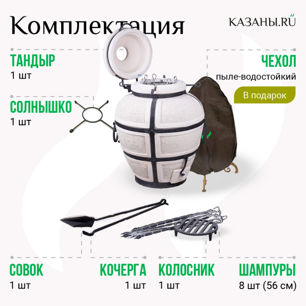 Толщина стенок в большом тандыре составляет 6 см. Высота конструкции с крышкой - 103 см, без крышки - 72 см. Диаметр в самой широкой части жаровни - 59 см, диаметр горловины- 25 см. В комплекте с тандыром поставляется набор из 10 шампуров, приспособление для их подвешивания, совок и кочерга. Комплектующие изготавливаются из металла методом ковки, что придает им дополнительную прочность. Также печь комплектуют подставкой из кованого металла. При желании можно подобрать другие аксессуары для тандыра, чтобы разнообразить количество доступных блюд.
